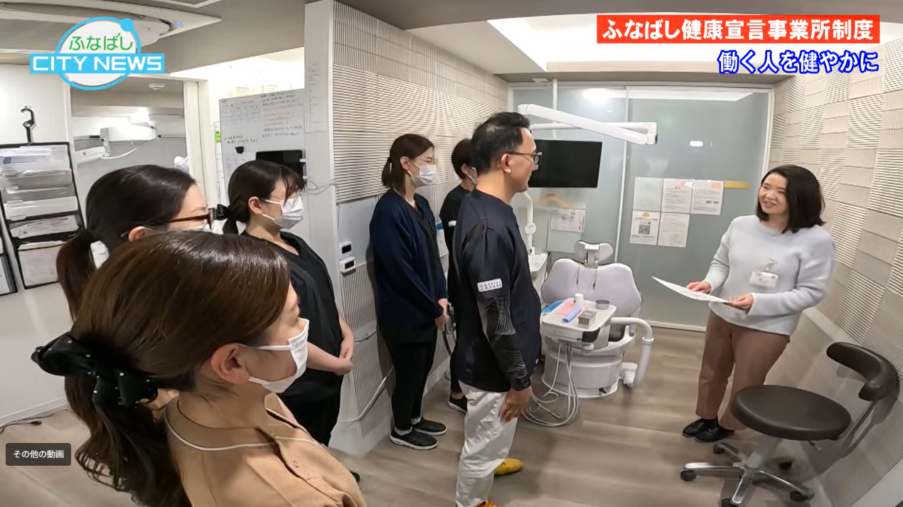本制度は、働く人の健康づくりを職場全体で実践する事業所を市が認定・応援するものです。当院では「患者様とスタッフは同じくらい大切である」という考えのもと、以下の取り組みを評価いただき、船橋市の公式広報番組「ふなばしCITYNEWS」にて取材を受けました。